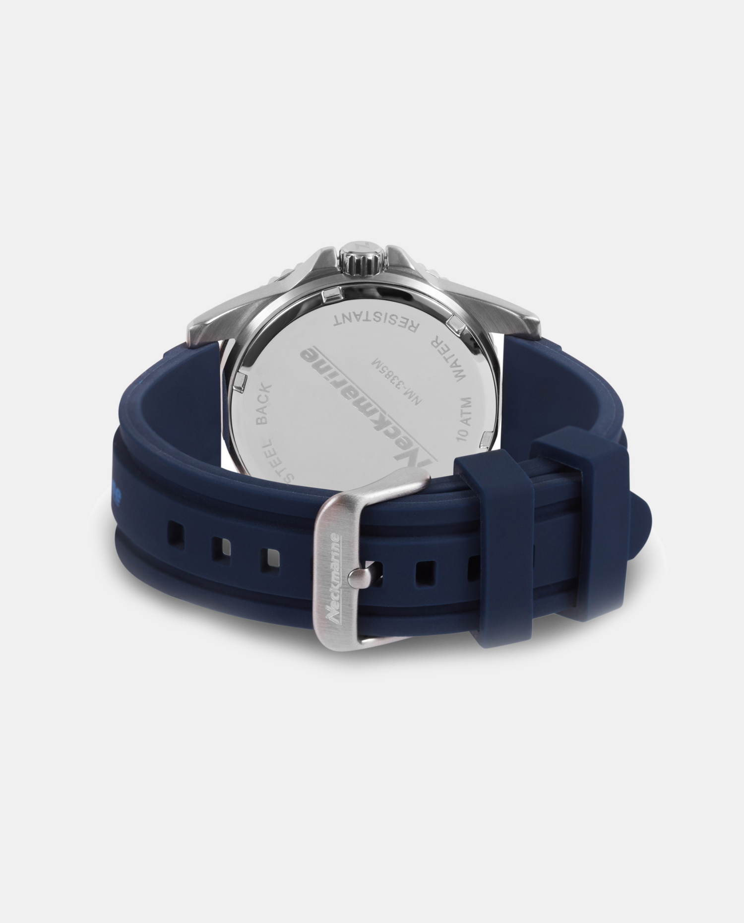 Reloj Neckmarine X-Treme en acero azul marino con esfera blanca, una fusión perfecta de elegancia y deportividad. Su pulsera de caucho resistente, bisel giratorio y movimiento Miyota 2317 garantizan precisión y durabilidad. Con resistencia al agua de 10 ATM, es el compañero ideal para quienes buscan estilo y rendimiento en cada momento.